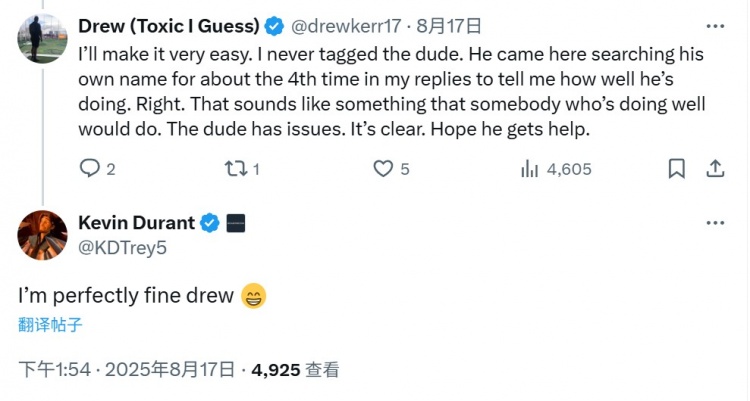 开云-网友:我从未@KD却老被他回复 他需要帮助 KD:我好得很兄弟😁